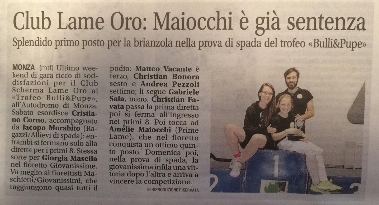 Ultimo weekend di gara ricco di soddisfazioni per il Club Scherma Lame Oro al «Trofeo Bulli&Pupe», all'Autodromo di Monza. Sabato esordisce Cristiano Corno, accompagnato da Jacopo Morabito (Ragazzi/Allievi di spada): entrambi si fermano solo alla diretta per i primi 8. Stessa sorte per §Giorgia Masella nel fioretto Giovanissime. Va meglio ai fiorettisti Maschietti/Giovanissimi, che raggiungono quasi tutti il podio: Matteo Vacante è terzo, Christian Bonora sesto e Andrea Pezzoli settimo; li segue Gabriele Sala, nono. Christian Favata passa la prima diretta poi si ferma all'ingresso nei primi 8. Poi tocca ad Amélie Maiocchi (Prime lame), che nel fioretto conquista un ottimo quinto posto. Domenica poi, nella prova di spada, la giovanissima infila una vittoria dopo l'altra e arriva a vincere la competizione.