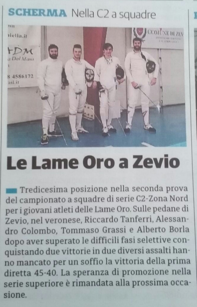 Tredicesima posizione nella seconda prova del campionato a squadre di serie C2-Zona-Nord per i giovani atleti delle lame Oro. Sulle pedane di Zevio, nel Veronese, Riccardo Tanferri, Alessandro Colombo, Tommaso Grassi e Alberto Borla dopo aver superato le difficili fasi selettive conquistano due vittorie in due diversi assalti hanno mancato per un soffio la vittoria della prima diretta 45-40. La speranza di promozione nella serie superiore è rimandata alla prossima occasione.