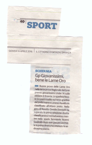 Buona prova delle Lame Oro nella terza prova Regionale del Gran premio giovanissimi Under 14 sulle pedane di Brescia. Lo spadista Nicolò Strusani è salito sul terzo grandino del podio mentre Lorenzo Ravelli si é classificato all'ottavo posto. Nella gara di fioretto Davide Doniselli ha superato la prima Selezione diretta classificandosi trentaduesimo mentre nella Spada femminile Noemi Guastalla dopo aver passato anch'ella la prima diretta ha ottenuto la sedicesima piazza.